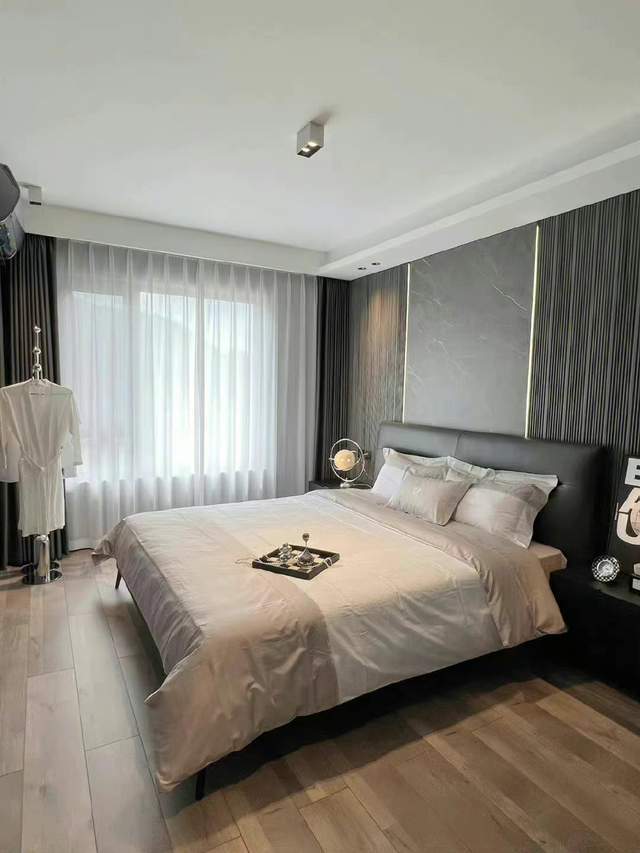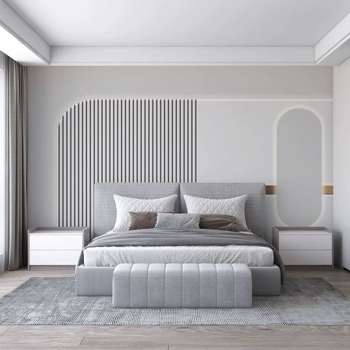 用珍珠白和荆楠橡木作为床头背景墙的主色调,加上少量的雪松绿作为装饰,整个房间的配色温柔治愈。简单的圆形配饰与色彩搭配完美融合,使房间看起来更加自然舒适。