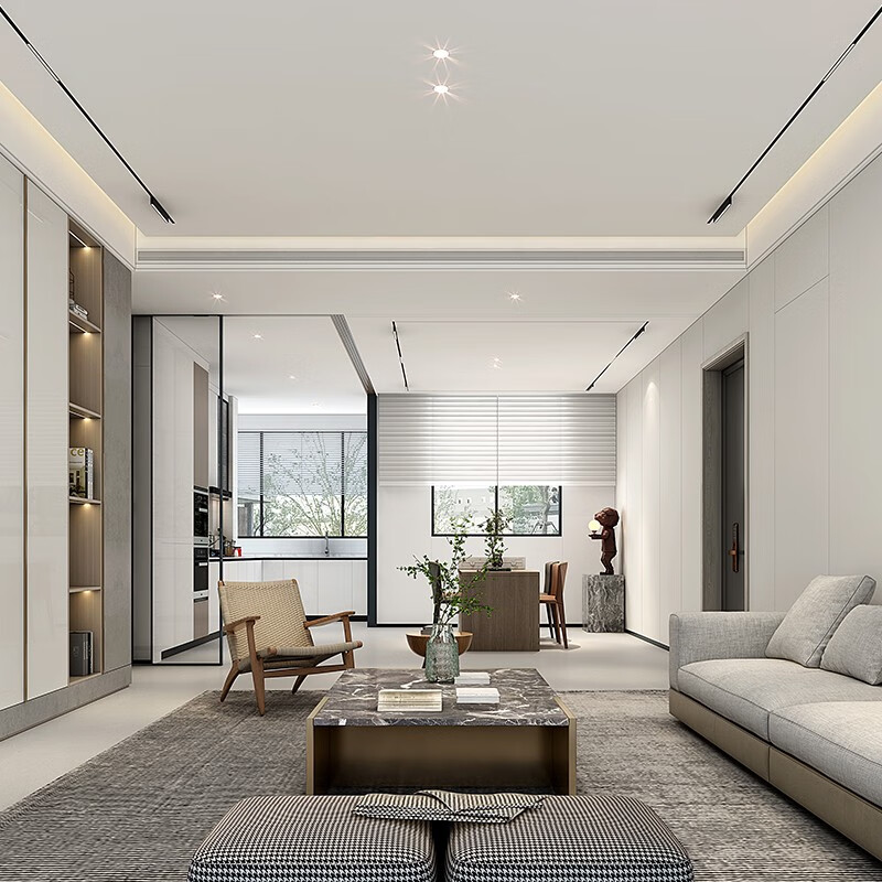 福建布加尼新材料有限公司发挥艺术的创想,用简练自如的笔法描绘现代艺术的情调。高级灰的色调展示了都会的气质,并将几何意象转化为简约美学语素。在光泽表面与精致纹路的组合下,金色艺术装置呈现出大理石背景墙肌理的线条清晰而雅致。静谧的灰色沙发和单椅与之相融合,洋溢出艺术的韵味。